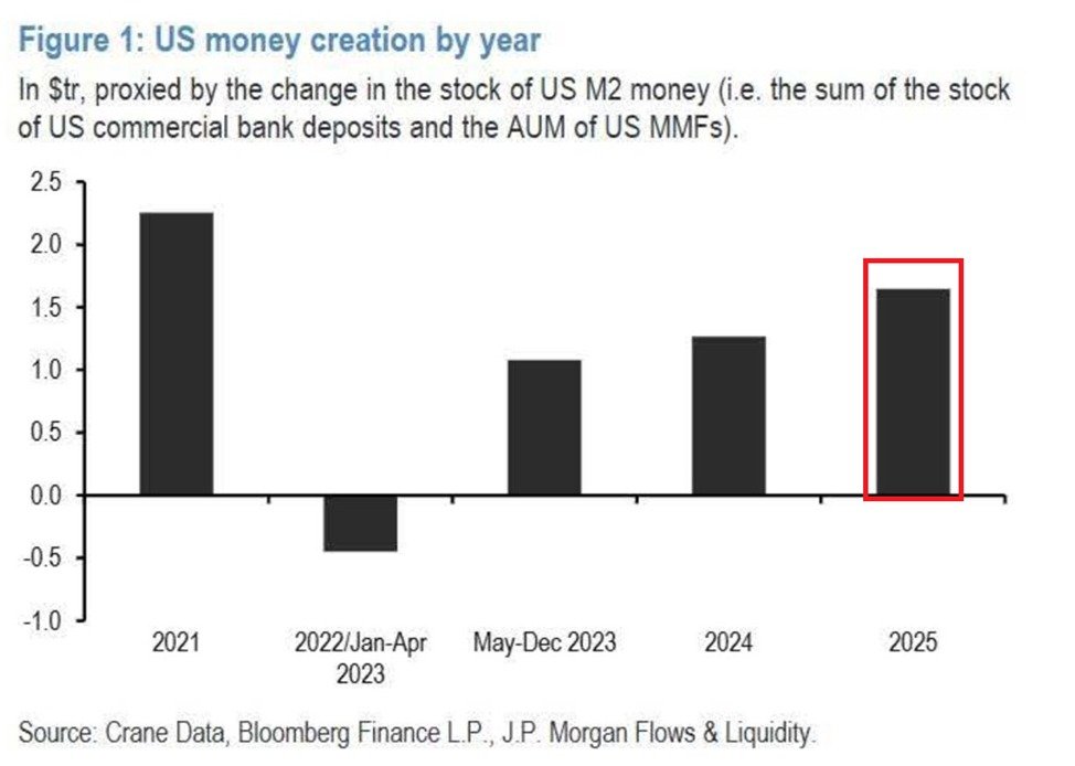– The net effect is the same: The Fed creates new bank reserves (money) to buy government debt, increasing liquidity that flows into deposits, money market funds, and broader measures like the proxy in the Kobeissi chart.