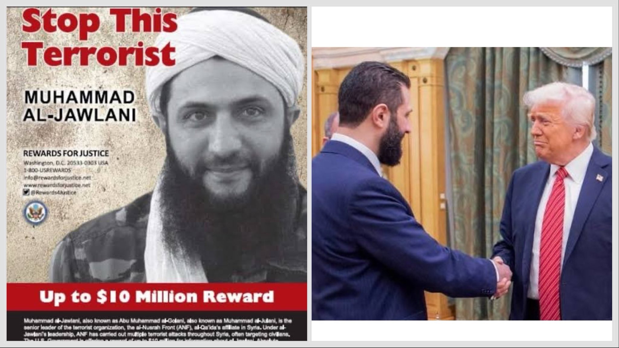 Today is Veterans Day. It is treasonous of Trump to have done this yesterday. The United States has spent decades battling jihadists. Conservatively, 7,000 U.S. soldiers have been killed and 36,000 seriously maimed since the attacks on September 11, 2001. I don’t care if Julani is really one of our own CIA creations. This vile satanic image of POTUS greeting a jihadist destroys any moral high ground the U.S. had. It is a disgrace.